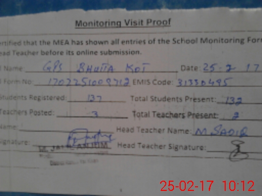 | EMIS Code: 31330495 | Name of School: GPS BHUTTA KOT | |||