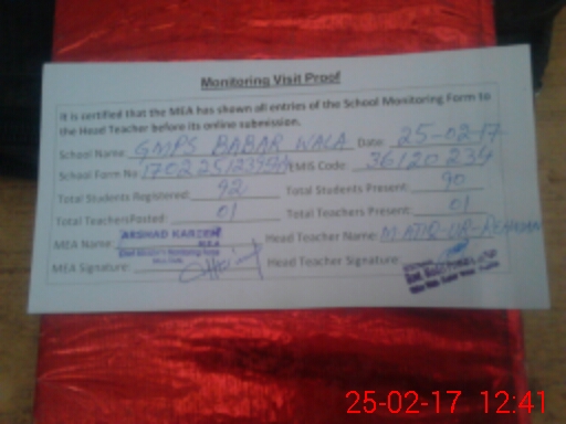 | EMIS Code: 36120234 | Name of School: GMPS BABAR WALA (KALO WALA) | |||
