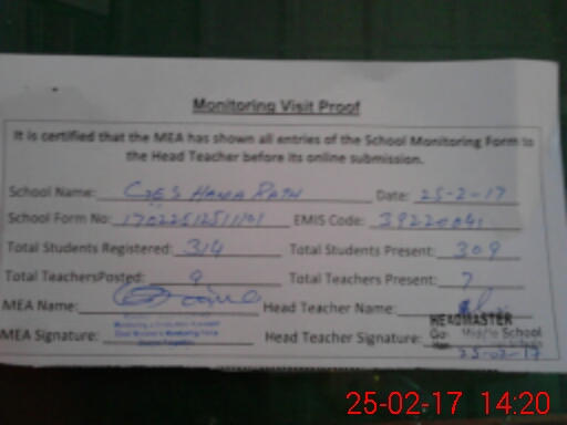| Certified that this School was Inspected by the Undersigned MEA/DMO Today and the Information Stated Above is as Per Record. | |||||