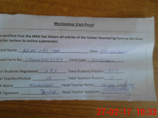 | Attendance Register | Head Teacher | MEA with School | Visit Proof |