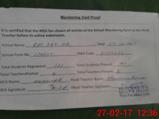 | EMIS Code: 31130235 | Name of School: GPS CHAK NO 284 HR | |||
