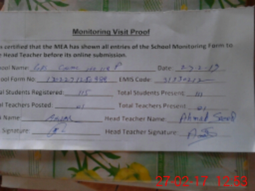 | Attendance Register | Head Teacher | MEA with School | Visit Proof |