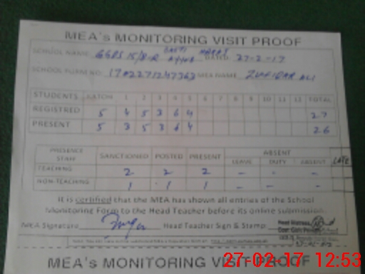 | Attendance Register | Head Teacher | MEA with School | Visit Proof |