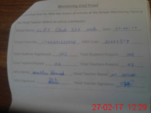 | EMIS Code: 33220519 | Name of School: GPS CHAK NO 256 JB SOUTH | |||