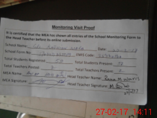 | Attendance Register | Head Teacher | MEA with School | Visit Proof |