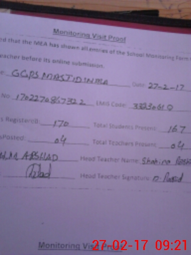 | Attendance Register | Head Teacher | MEA with School | Visit Proof |