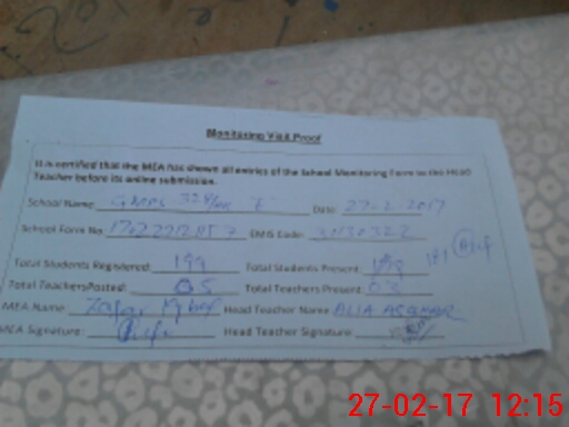 | Attendance Register | Head Teacher | MEA with School | Visit Proof |