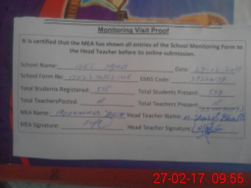 | Certified that this School was Inspected by the Undersigned MEA/DMO Today and the Information Stated Above is as Per Record. | |||||