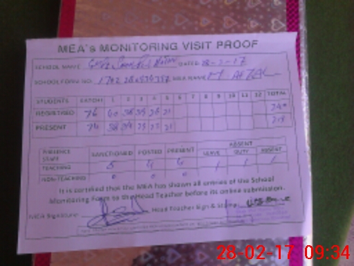 | Attendance Register | Head Teacher | MEA with School | Visit Proof |