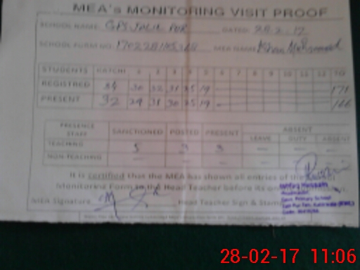 | Attendance Register | Head Teacher | MEA with School | Visit Proof |