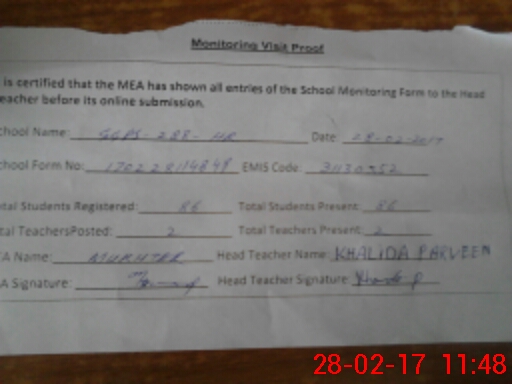 | Attendance Register | Head Teacher | MEA with School | Visit Proof |