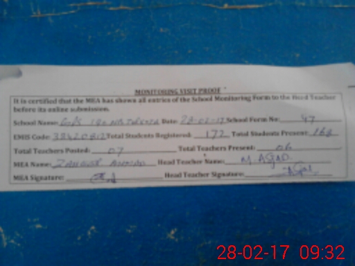 | Attendance Register | Head Teacher | MEA with School | Visit Proof |