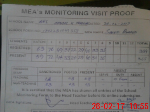 | Attendance Register | Head Teacher | MEA with School | Visit Proof |