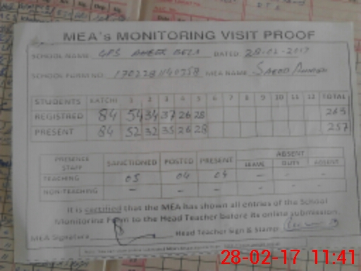| Attendance Register | Head Teacher | MEA with School | Visit Proof |