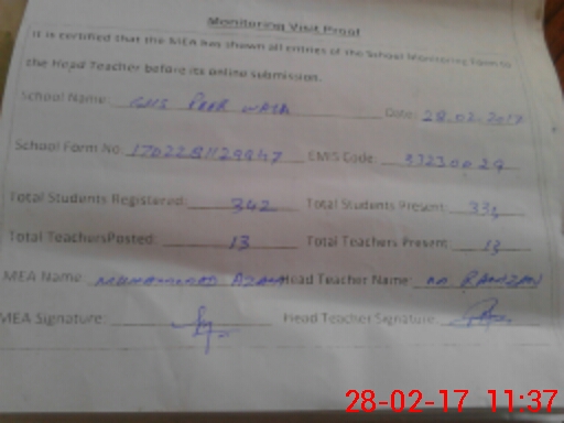 | EMIS Code: 33230029 | Name of School: GHS PIR WALA | |||