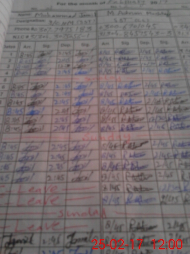 | CNIC | Full Name | Designation | R/C | Absence During Last Calender Month |
