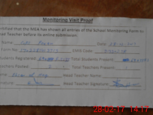 | Attendance Register | Head Teacher | MEA with School | Visit Proof |