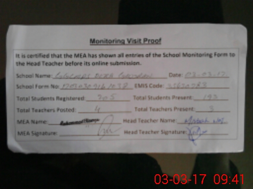 | Attendance Register | Head Teacher | MEA with School | Visit Proof |