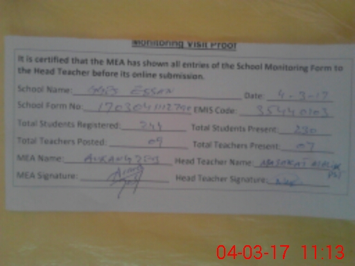 | Certified that this School was Inspected by the Undersigned MEA/DMO Today and the Information Stated Above is as Per Record. | |||||