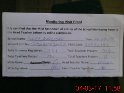 | Attendance Register | Head Teacher | MEA with School | Visit Proof |
