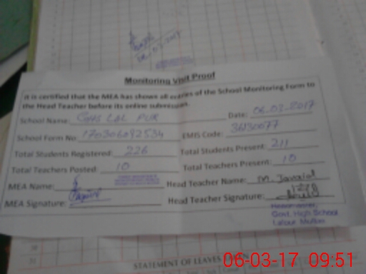 | EMIS Code: 36130077 | Name of School: GHS LAL PUR CHAK NO. 15 FAIZ | |||