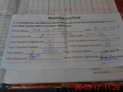| Attendance Register | Head Teacher | MEA with School | Visit Proof |