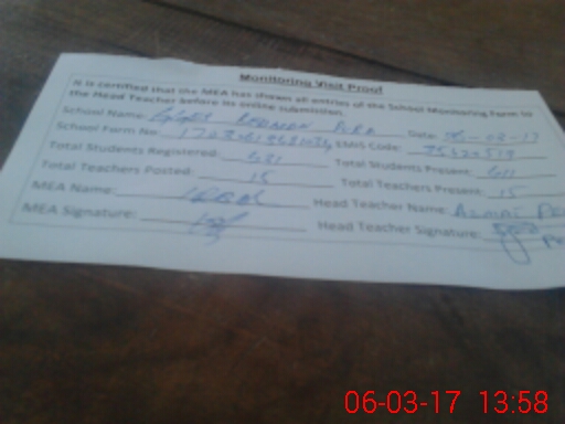 | Attendance Register | Head Teacher | MEA with School | Visit Proof |