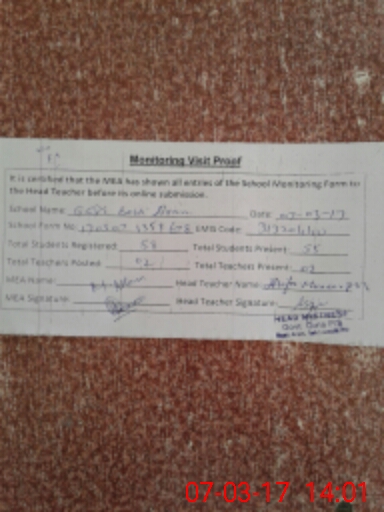 | Attendance Register | Head Teacher | MEA with School | Visit Proof |