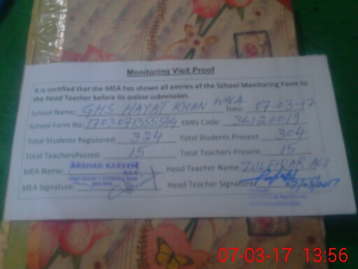 | EMIS Code: 36120019 | Name of School: GHS HAYAT KHAN WALA SHUJABAD | |||