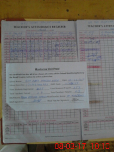 | Total no. of Classrooms: 3 No. of Classrooms Used for Teaching: 3 No. of Classrooms Storing Old Furniture, FTBs, etc: 0Comments if Any: Required more class room NASEER ANJAM ESE ON DUTY BUT ORDER OF DUTY NOT PROPERLY SCHOOL NAME NOT IN THE ORDER SO MARK AN ABSENT |