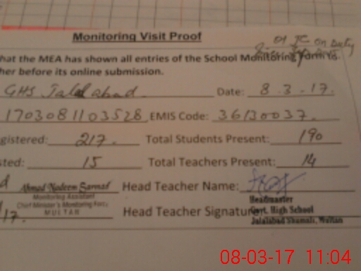 | EMIS Code: 36130037 | Name of School: GHS JALAL ABAD SHUMALI MULTAN | |||