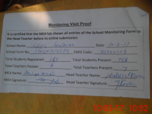 | Attendance Register | Head Teacher | MEA with School | Visit Proof |
