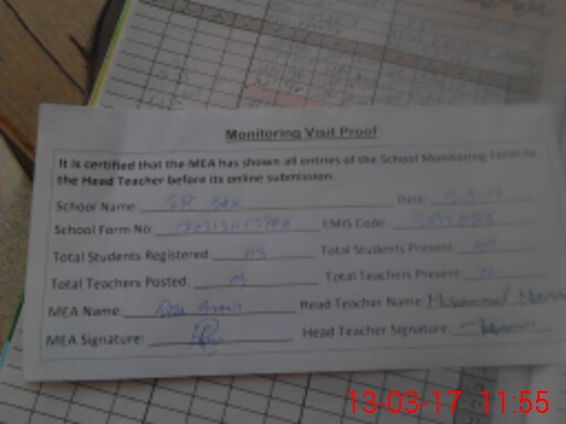 | Attendance Register | Head Teacher | MEA with School | Visit Proof |