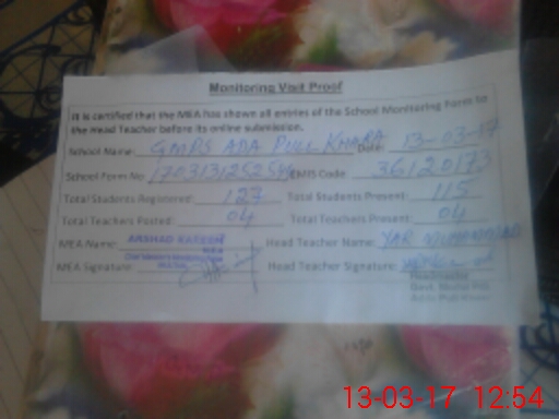 | EMIS Code: 36120173 | Name of School: GMPS ADA PULL KHARA | |||