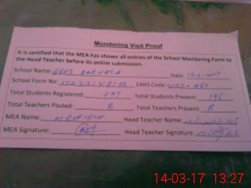 | School Visited by School Health & Nutrition Supervisor (No. of Visits) | 1 | Name1: | Sardar Abdul Qayyum | Name2: | |