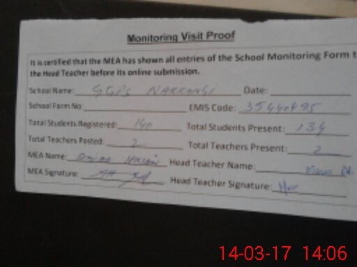 | Attendance Register | Head Teacher | MEA with School | Visit Proof |