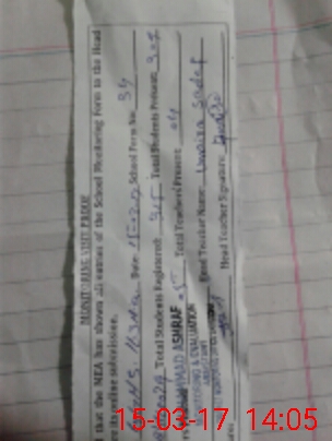 | School Visited by School Health & Nutrition Supervisor (No. of Visits) | 1 | Name1: | KHAWAR HAYAT SHAH | Name2: | |