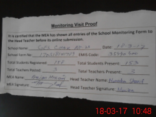| Attendance Register | Head Teacher | MEA with School | Visit Proof |