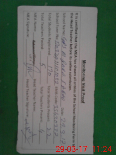 | Remarks (Use Separate Page if Required): 1 Due to exams off students are not present at school 2 Teacher Muhammad Afzal PST not present at school nor his leave application or any thing else is available at school | |||||