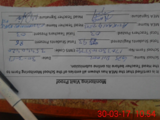 | Attendance Register | Head Teacher | MEA with School | Visit Proof |