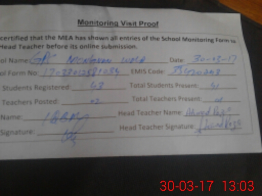 | Attendance Register | Head Teacher | MEA with School | Visit Proof |
