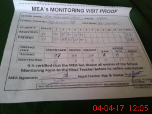 | Attendance Register | Head Teacher | MEA with School | Visit Proof |