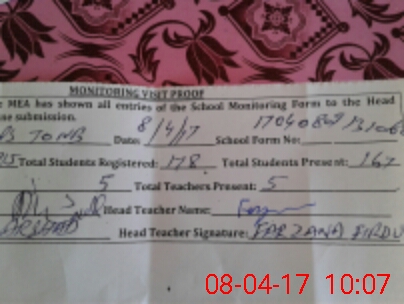 | Attendance Register | Head Teacher | MEA with School | Visit Proof |