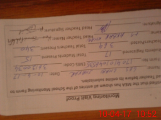 | Attendance Register | Head Teacher | MEA with School | Visit Proof |