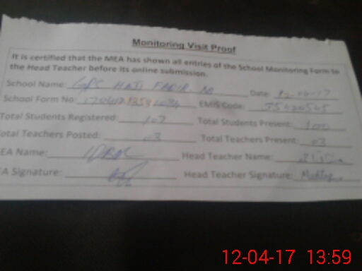 | Attendance Register | Head Teacher | MEA with School | Visit Proof |