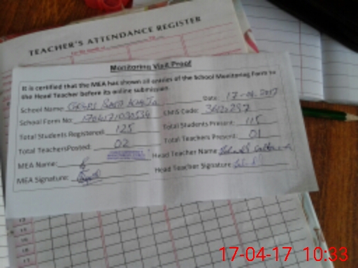 | Attendance Register | Head Teacher | MEA with School | Visit Proof |
