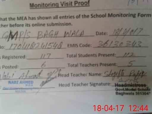 | EMIS Code: 36130343 | Name of School: GMPS BAGH WALA NEAR B Z UNIVERSITY | |||
