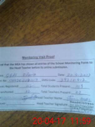 | Attendance Register | Head Teacher | MEA with School | Visit Proof |