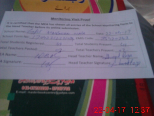 | Attendance Register | Head Teacher | MEA with School | Visit Proof |