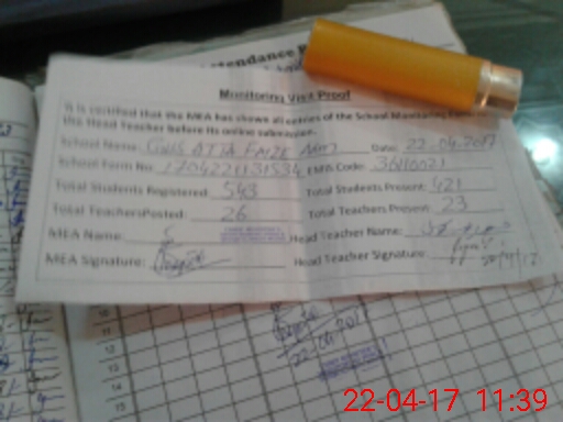 | Attendance Register | Head Teacher | MEA with School | Visit Proof |